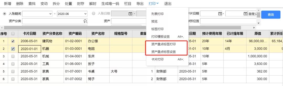 在“卡片管理”中选择“资产盘点标签打印”和“资产盘点标签设置”,设置完成后,就可以打印资产标签,用于管理、盘点固定资产。