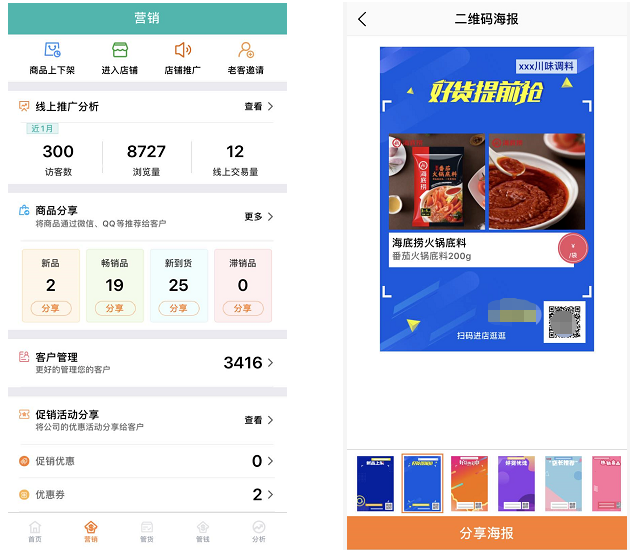 针对这种情况,xxx川味调味品批发借助畅捷通软件好生意旺铺商城,把手机旺铺放到微信小程序上,业务员通过【手机旺铺】-商品海报分享等推广动作,引导客户进入旺铺自主下单,海报可选择多种模版,旺铺与进销存系统数据实时互通,随时订货,有效减少错单漏单,便捷的代下单功能,让订货效率更高效,避免额外工作,给业务员的工作带来极大便利,老板审核订单后就可打单安排配送员发货。