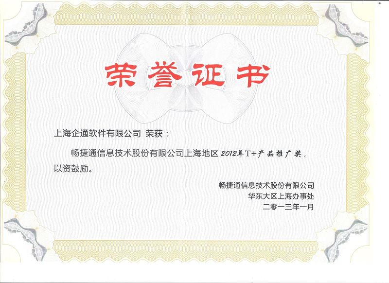 2012畅捷通T+产品推广奖